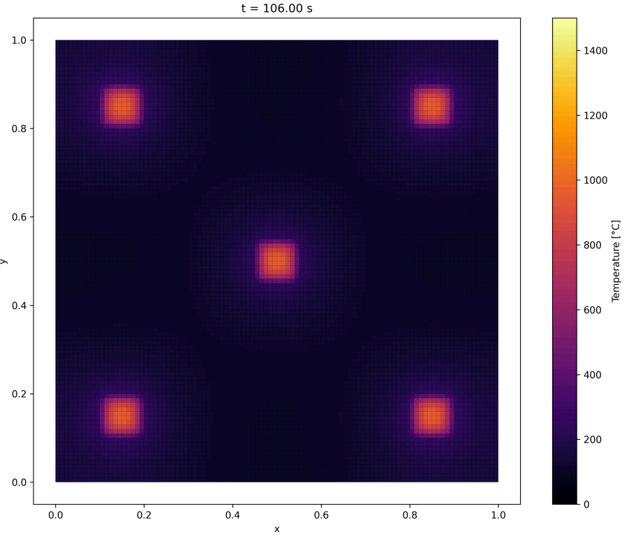 Engineering-focused simulation solving a transient heat conduction problem with internal heat sources using the Finite Element Method.